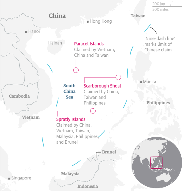 China has backed its expansive claims with island-building and naval patrols. The US says it does not take sides in territorial disputes, but has sent military ships and planes near disputed islands, calling them “freedom of navigation” operations to ensure access to key shipping and air routes.
