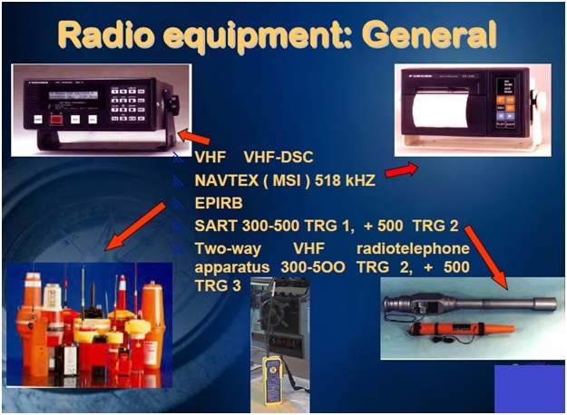 VHF DSC, VHF RT, MF DSC, MF RT, EPIRB, SART, Portable VHF, transceiver, Navtex receiver 518 khz, EGC receiver (where Navtex not available)