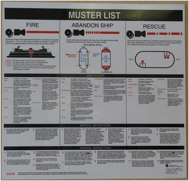 A muster list provides crew members with a plan to manage emergency situations. It gives clear instructions to be followed in the event of an emergency for every person on board and ensures that all vital duties are assigned. The muster list also ensures that, on the sounding of the emergency signal, crewmembers and passengers know where to muster. This allows everyone on board to be readily accounted for at the outset of an emergency.