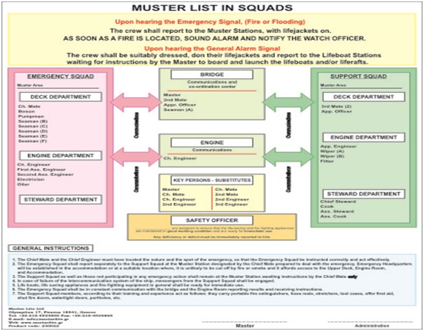 Muster list is prepared on ship so that ship crew must be ready all the time to tackle and fight against any kind of emergencies which can arise due to reasons such as rough weather, machinery malfunction, pirate attack, human error etc. Such emergencies can lead to fire, collision, flooding, grounding, environmental pollution, and loss of life.
