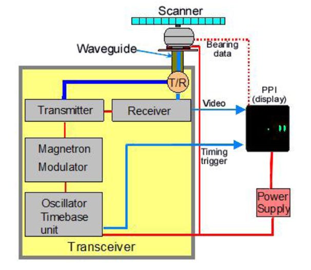 Radars transmit directional microwave radio pulses with a rotating ariel (the scanner) in a 360º circle around the machine. It detects the bearing and range of echoing pulse returns from significant surrounding targets to produce a map like display.
